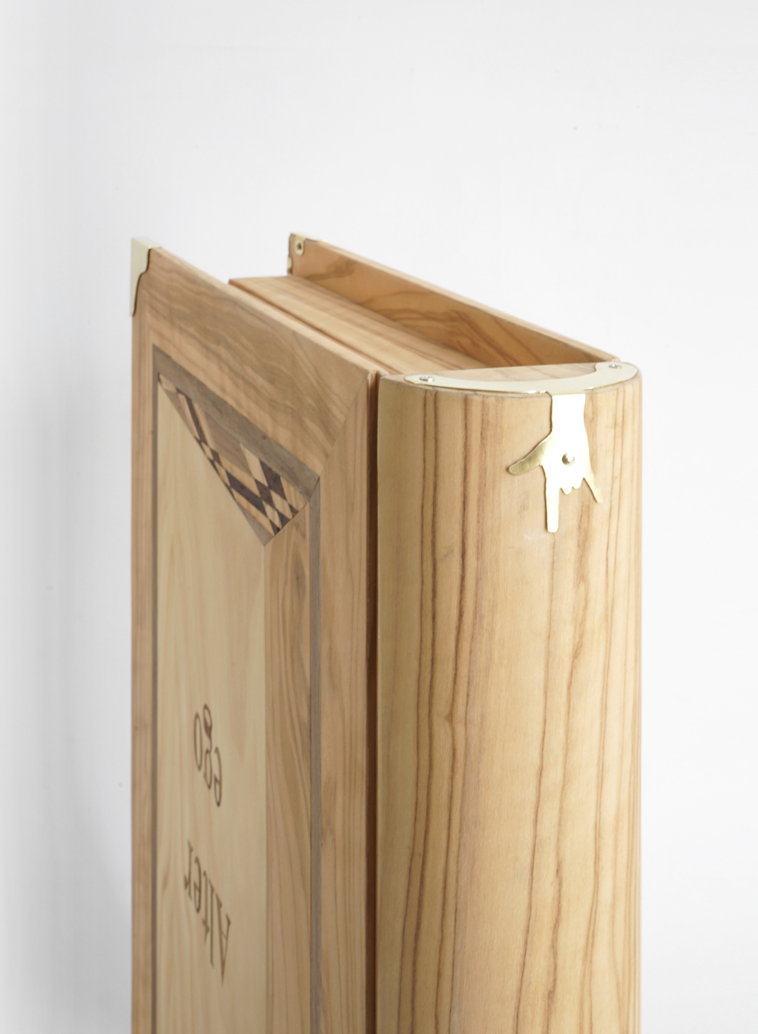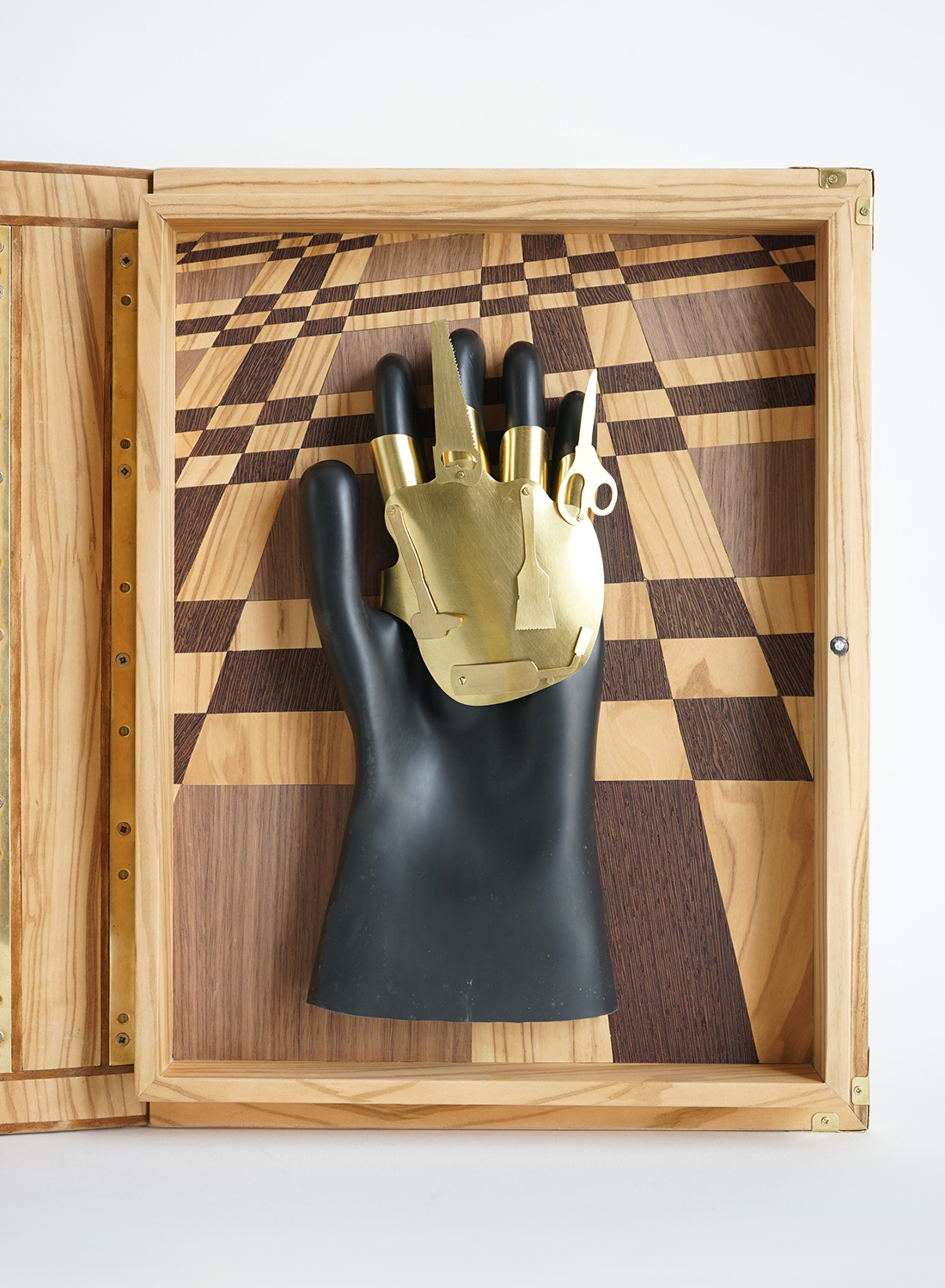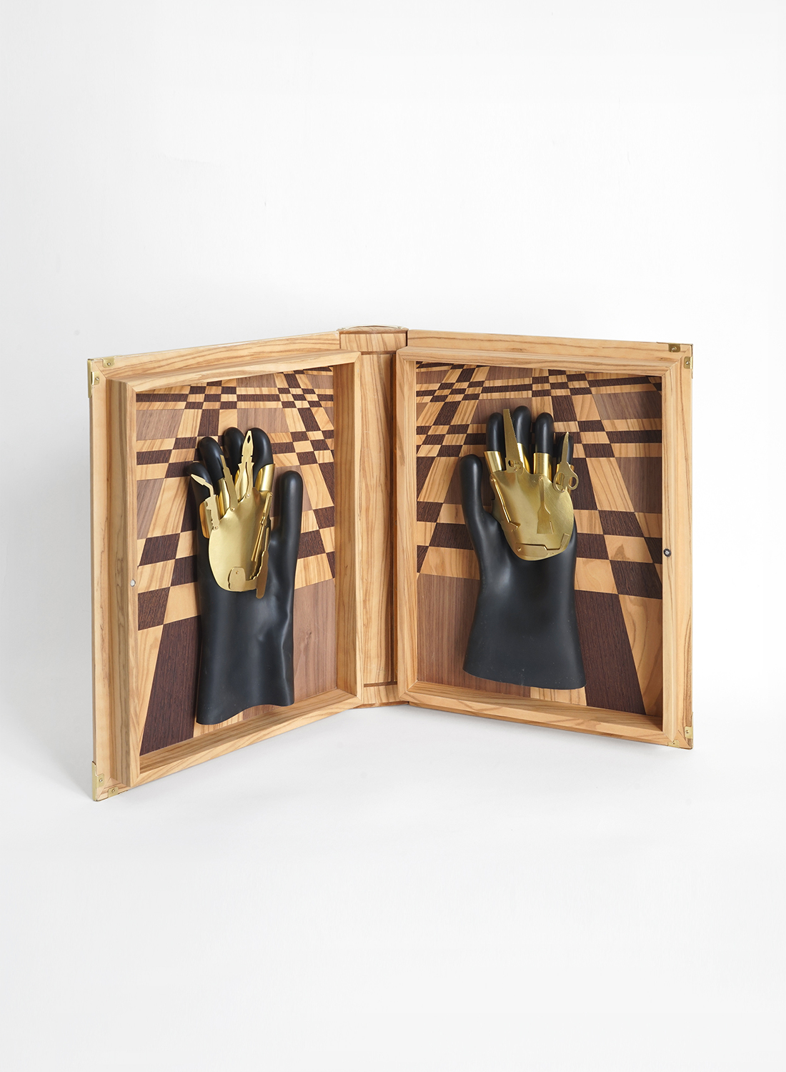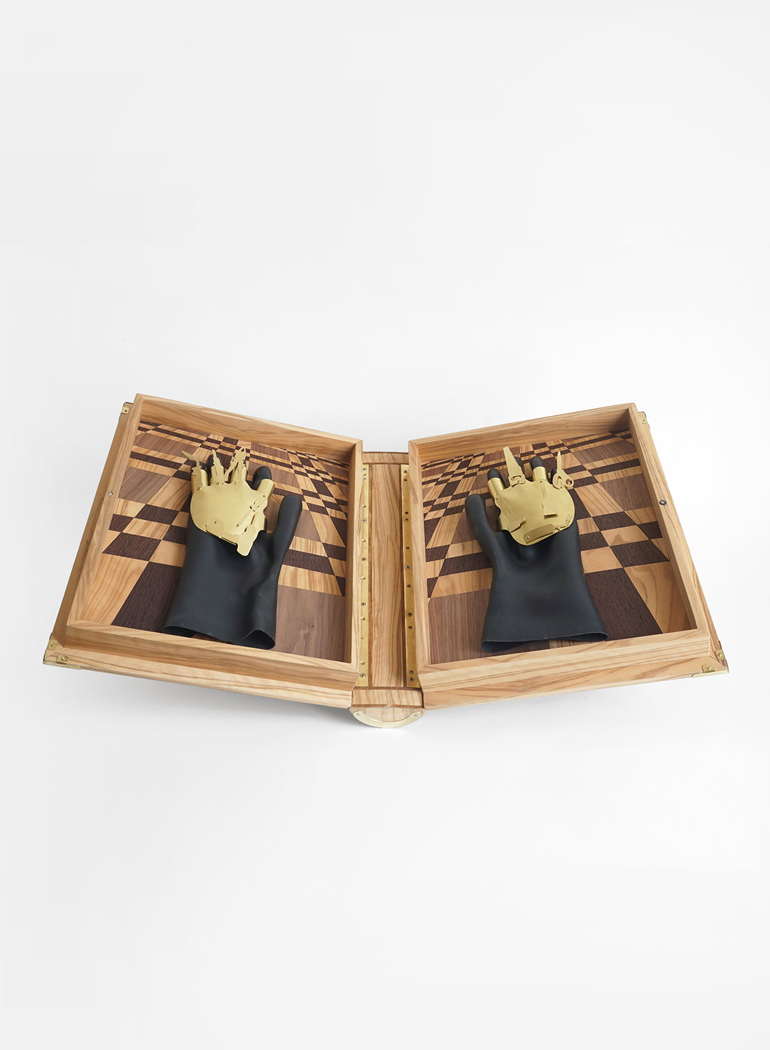 Alter ego, 2025, inlaid wood, brass, rubber gloves. H40x65x16cm.