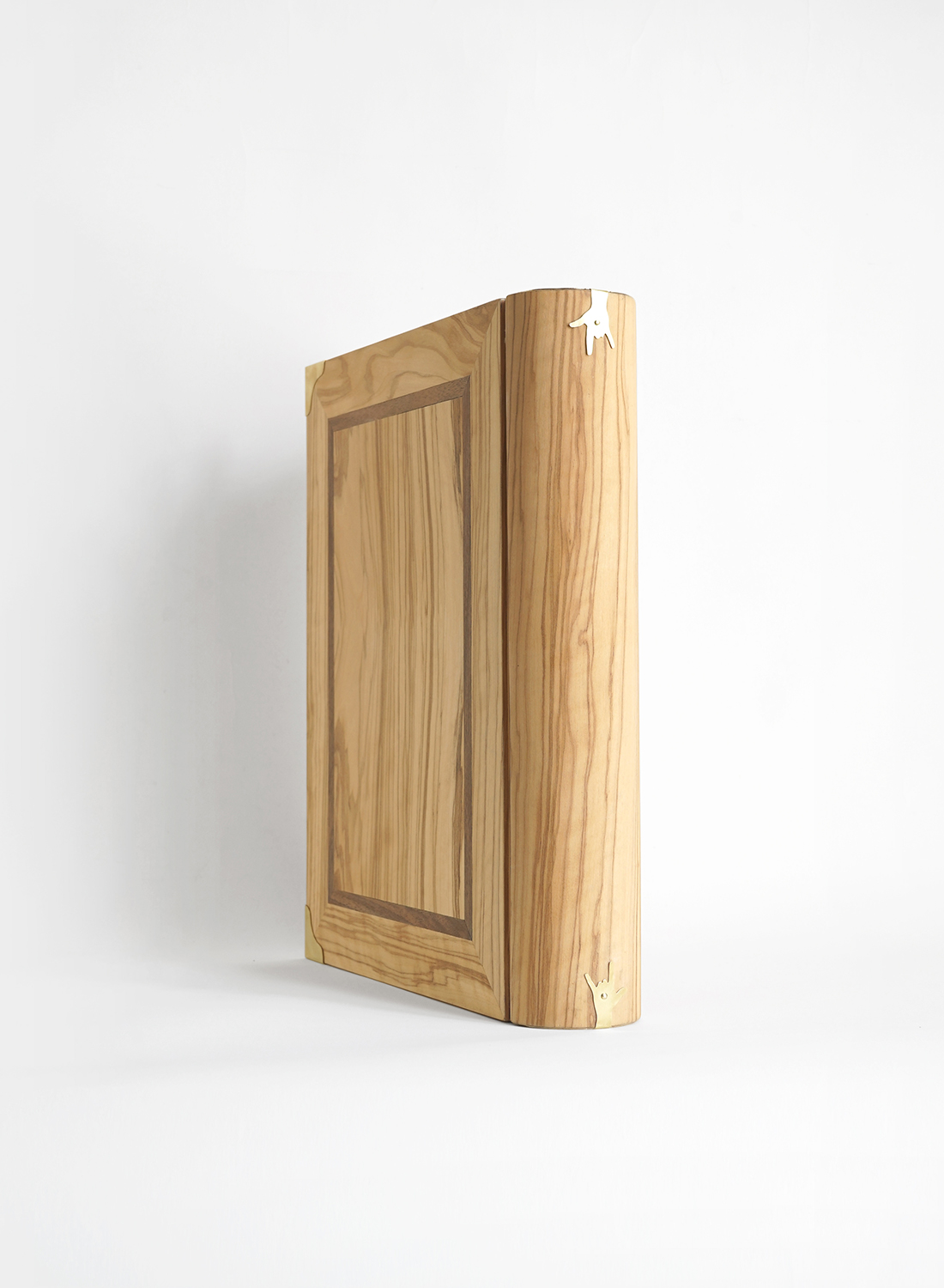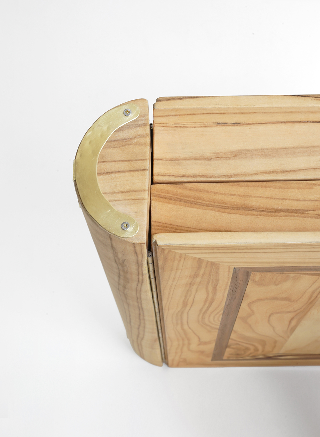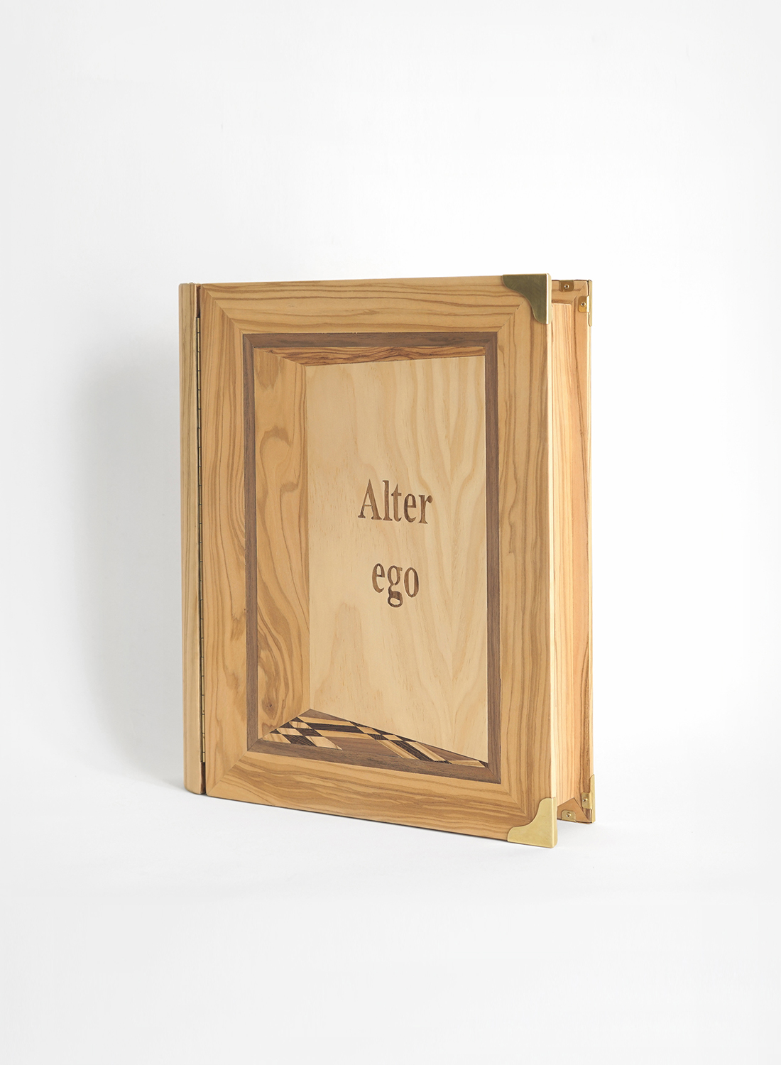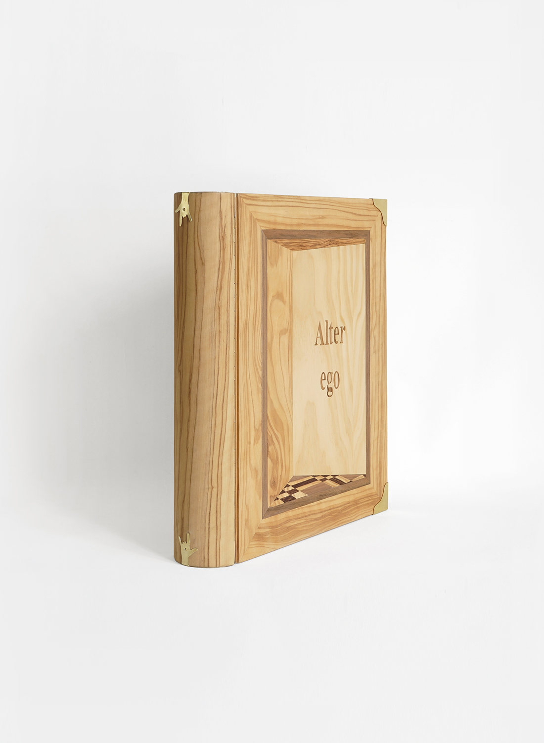 Alter ego, 2025, inlaid wood, brass, rubber gloves. H40x65x16cm.